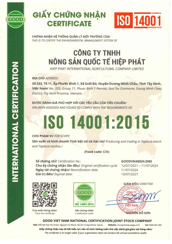Hiện nay, nhà máy Hiệp Phát đạt các chứng nhận quan trọng gồm HACCP, ISO 9001:2015, ISO 14001:2015 và ISO 22000:2018 cho hoạt động sản xuất và kinh doanh tinh bột sắn (mì) công nghiệp.